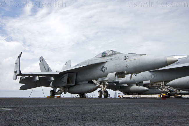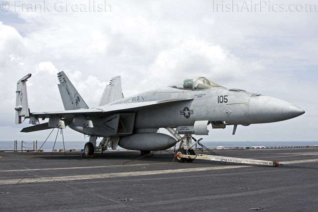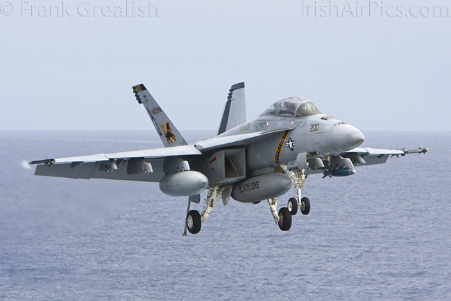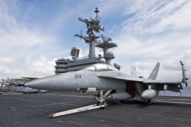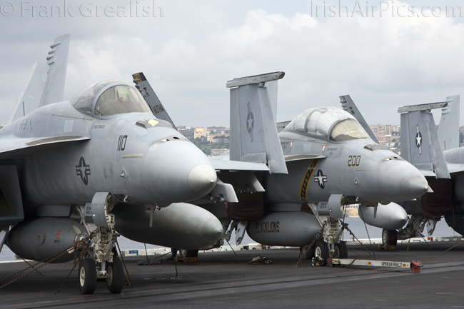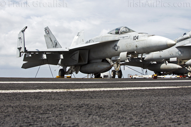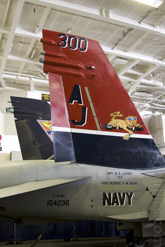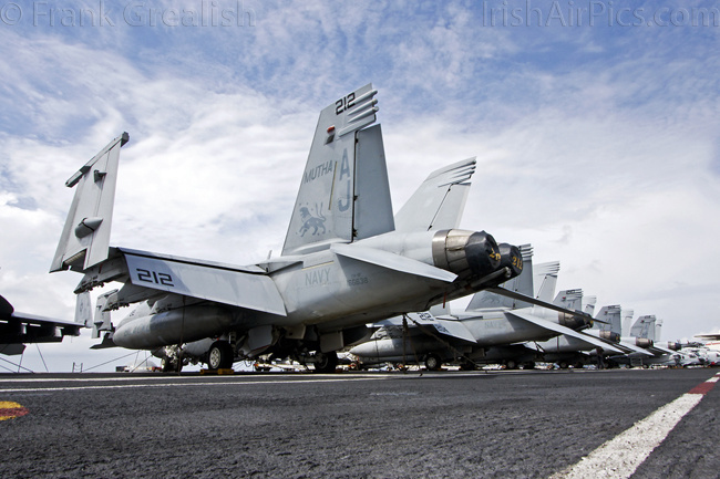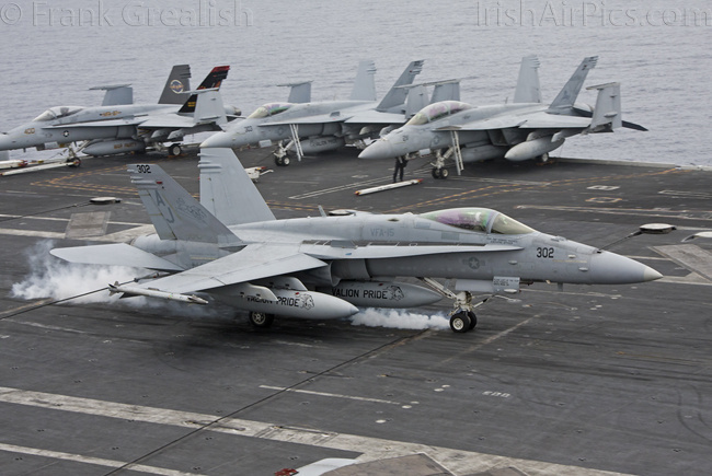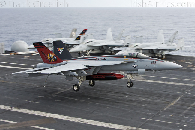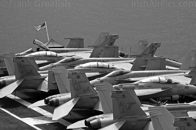 The strike aircraft on the USS Bush, as mentioned earlier, all consist of different versions of the same aircraft family, the Boeing F/A-18 Hornet / Super Hornet. The consolidation of aircraft types to a common airframe creates efficiencies in terms of maintenance, logistics, and launching multiple aircraft.Strike Fighter Squadron 31 (VFA-31) Tomcatters fly the F/A-18E while Strike Fighter Squadron 213 (VFA-213) Black Lions fly the F/A-18F. Both units are former Tomcat units and in 2006 when the Tomcat was withdrawn from service, aircrews were wearing patches declaring "Tomcat by choice, Hornet by mandate". 5 years on those sentiments have been long forgotten and aircrews have firmly embraced the capabilities of the Super Hornet over the Tomcat.