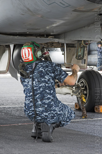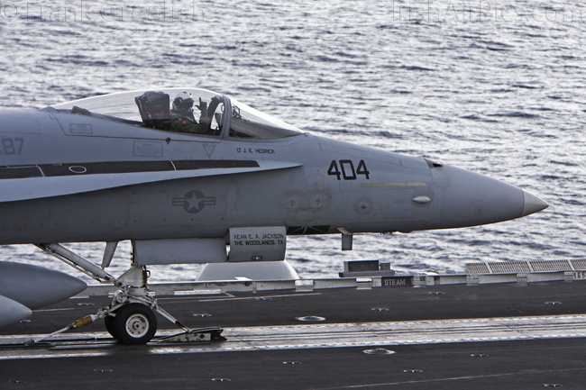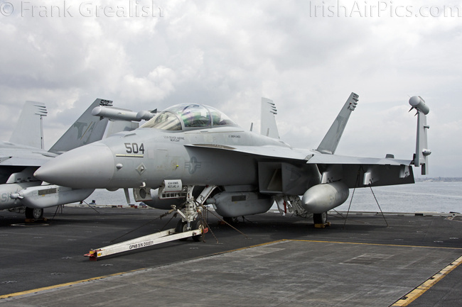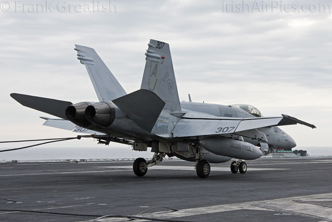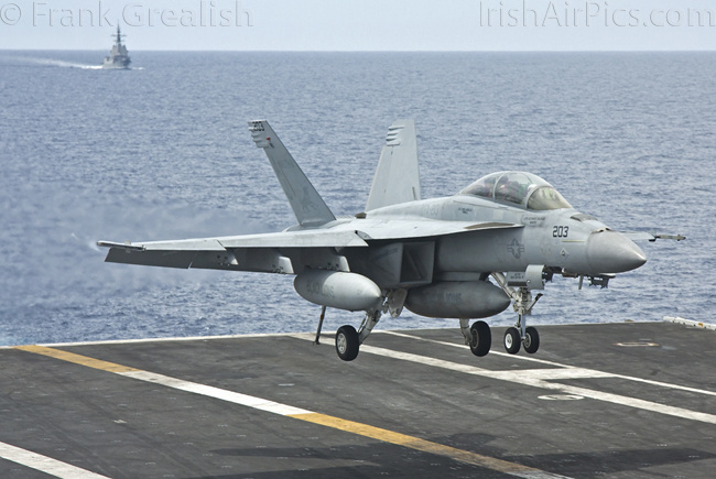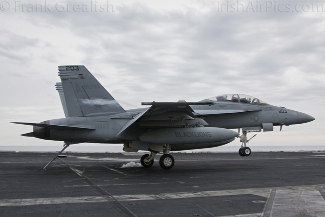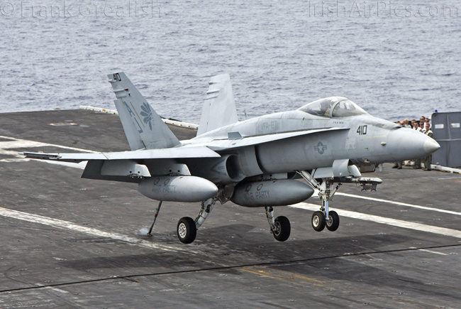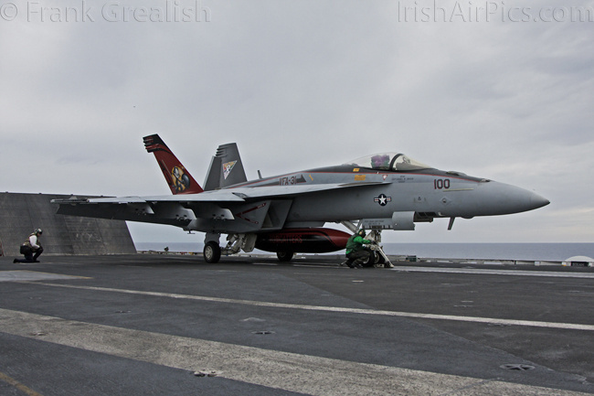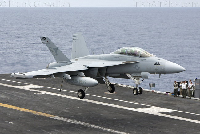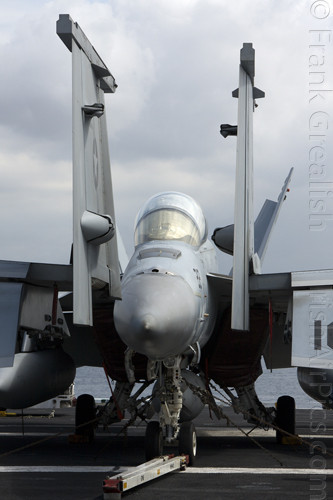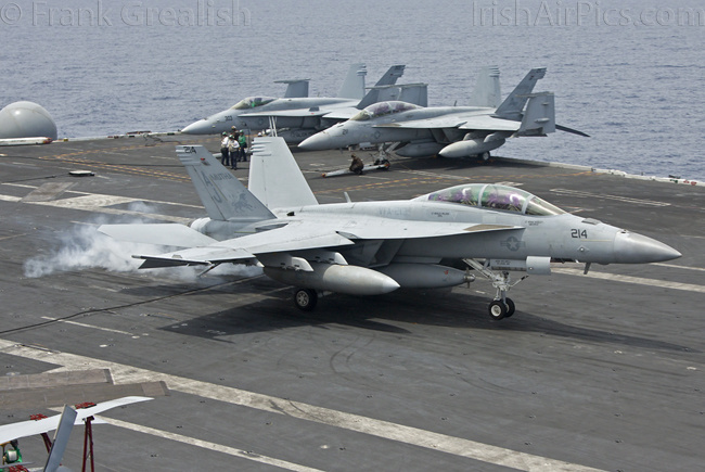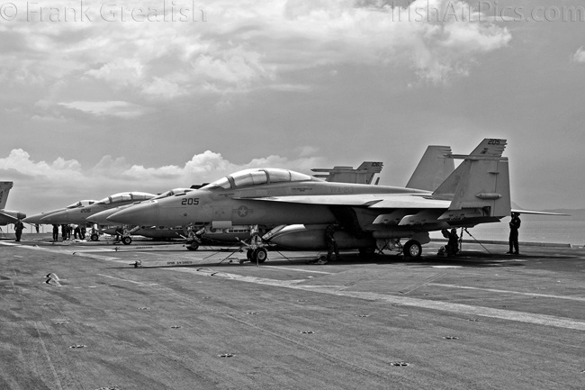 The strike aircraft on the USS Bush, as mentioned earlier, all consist of different versions of the same aircraft family, the Boeing F/A-18 Hornet / Super Hornet. The consolidation of aircraft types to a common airframe creates efficiencies in terms of maintenance, logistics, and launching multiple aircraft.Strike Fighter Squadron 31 (VFA-31) Tomcatters fly the F/A-18E while Strike Fighter Squadron 213 (VFA-213) Black Lions fly the F/A-18F. Both units are former Tomcat units and in 2006 when the Tomcat was withdrawn from service, aircrews were wearing patches declaring "Tomcat by choice, Hornet by mandate". 5 years on those sentiments have been long forgotten and aircrews have firmly embraced the capabilities of the Super Hornet over the Tomcat.