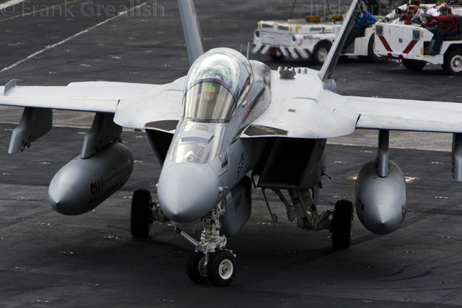 The EA-18G Growler operated by VAQ-141 is an electronic attack derivative of the F/A-18F Super Hornet and replaces the EA-6B Prowler on board the carrier. The Growler has more than 90% commonality with a standard Super Hornet, both aircraft have similar flight and performance characteristics, this similarity allowing the Growler to fly with the strike package and perform escort jamming in addition to the more traditional standoff jamming role.The Growler and Super Hornet share an airframe, the Raytheon AN/APG-79 AESA radar and weapon systems such as the AN/AYK-22 Stores Management System. Most of the Growlers electronic attack equipment is mounted in the space that used to house the internal 20 mm cannon while AN/ALQ-218 wideband receivers pods replace the missile launch rails on the wingtips.