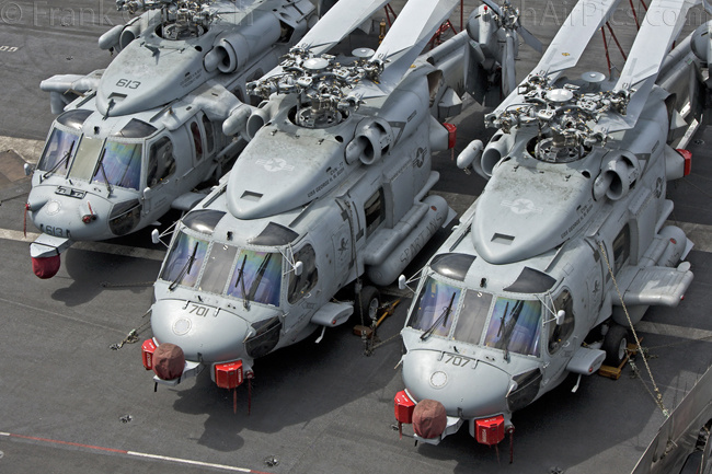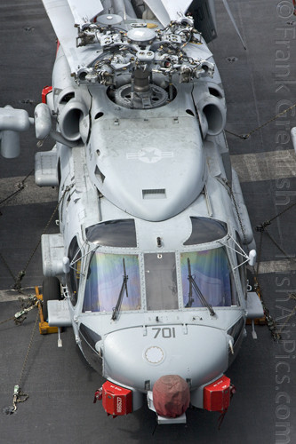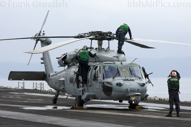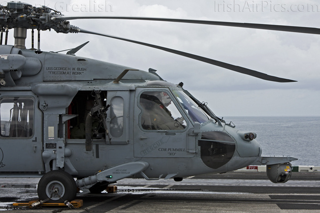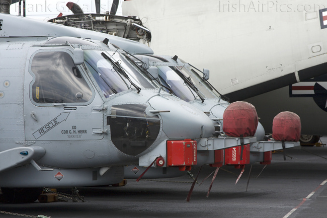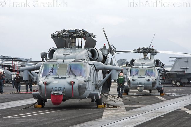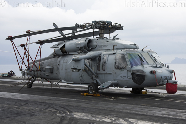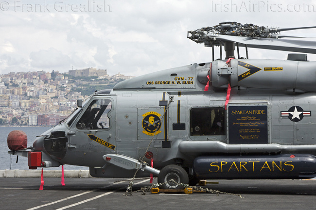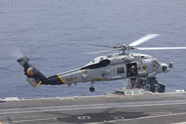 HSM-70 Spartans, one of CVW-8's two helicopter squadrons, has introduced a new helicopter type on the deployment, in the shape of the Sikorsky MH-60R Romeo. The MH-60R is designed to combine the features of the SH-60B and SH-60F into a multi-mission single helicopter platform.Operated by a crew of three, the MH-60R has a primary role of Anti Submarine Warfare (ASW) with secondary roles that include Search and Rescue (SAR), vertical replenishment (VERTREP), fire support, medical evacuation, and communications relay. All Helicopter Anti-Submarine (HS) and Helicopter Anti-Submarine Light (HSL) squadrons that receive the MH-60R will be re-designated Helicopter Maritime Strike (HSM) squadrons.