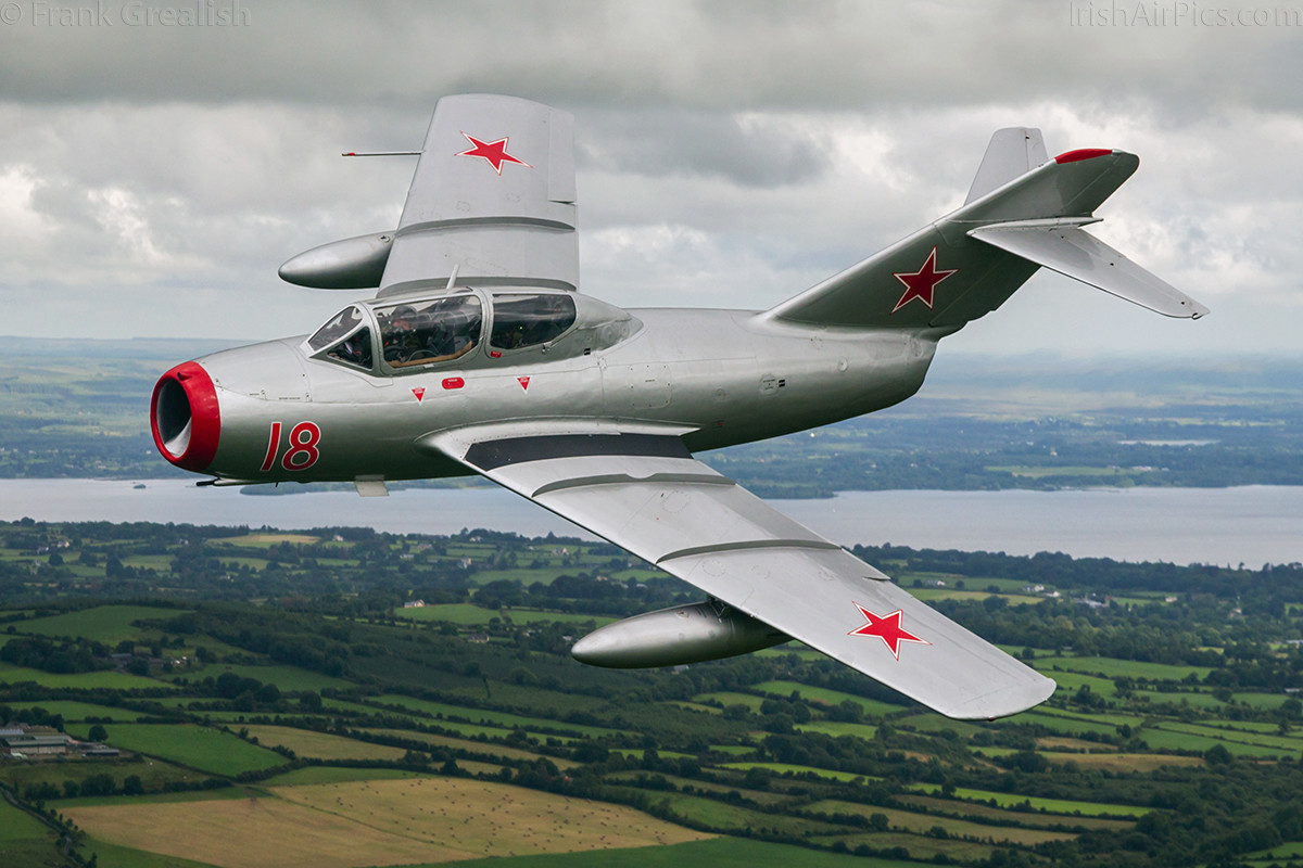 Flying from Cork Airport in a Piper Seneca from the Atlantic Flight Training Academy, we were joined by four visitors... The Norwegian Air Force Historical Squadron MiG-15, the Strikemaster Display Team with a pair of BAC Strikemasters, Patrouille Tranchant flying four Fouga CM-170 Magisters and the Irish Historic Flight flying three De Havilland Canada Chipmunks. The weather was typically Irish, dull and overcast with a bit of rain lurking around, but despite this, the cloud base was high enough and everyone joined up as planned.